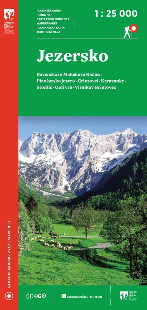 Zemljevid Jezersko - 1 : 25.000 obsega območje med Planino Spodnja Dolga njiva pod Košuto, vasjo Korte/Trögern in Pristovškim Storžičem na severu, Rinkami in Belo/Bad Vellachom na vzhodu, Bivakom pod skuto in Storžičem na jugu ter Storžičem in Planino spodnja Dolga njiva na zahodu. Na zadnji strani zemljevida najdete predstavitev Občine Jezersko, opise sprehajalnih poti ter priročno karto središča prve slovenske Gorniške vasi.