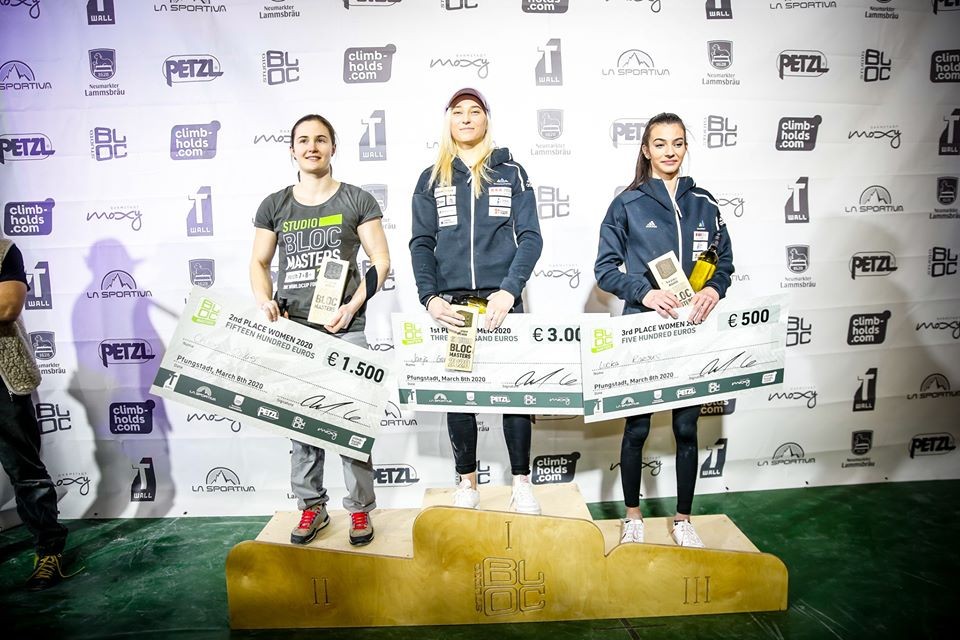 Janja Garnbret na prvi in Lučka Rakovec na tretji stopnički Studio Bloc Mastersa 2020, druga je bila Belgijka Chloé Caulier (foto Tobias Goldzahn)