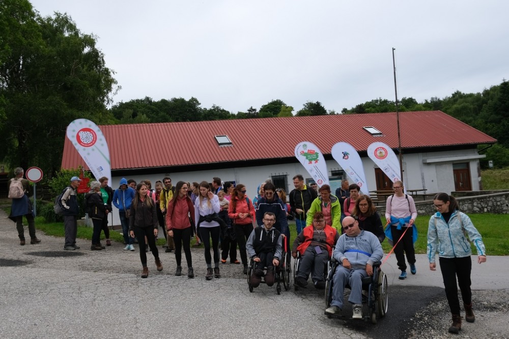 Na sliki skupina pohodnikov na travi, v ospreduju trije na invalidskih vozičkih, v ozadju je hribovje. Arhiv Pin/OPP
