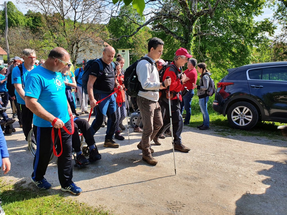 Težko pričakovani dan je napočil. Bila sem zaskrbljena, saj je pred tem veliko deževalo in so me skrbela razmočena tla, ki lahko bistveno otežijo naše gibanje. Z avtobusom smo se pripeljali do vasi Planina pod Mirno goro, kjer so nas pričakali naši podporniki in udeleženci pohoda zelo različnih kategorij hendikepa. Pohodi nas povezujejo med seboj in skrbijo tudi za našo integracijo med polnočutne, njim pa omogočijo vsaj bežen vpogled v naš svet v okoliščinah, ki niso naš vsakdan. Nemalokrat so bolj kot mi sami zaskrbljeni, kako bomo dosegli cilj. Vaja dela mojstra, oni pa na njihovo srečo te vaje niso izkusili, v človeku pa želja ne umre s prikrajšanostjo na telesnem nivoju. K sreči nam je marsikdo pripravljen nadomestiti manjko, ki pesti posameznika pri popolnoma samostojni poti do cilja, ki smo si ga zastavili. Hvala vsem v imenu nas vseh. Zaradi njih so naša življenja bolj pestra in polnejša. Skratka, zbranih nas je bilo okoli dvesto udeležencev. Bilo je tudi kar nekaj novinarjev. Tokrat je bil glavni cilj spraviti na vrh udeležence akcije Gibalno ovirani gore osvajajo. Že pri njih je velika različnost vzrokov za stanja v katerih so se znašli, a cilj je bil isti in to je, premagati pot na goro. Različnost vozičkov je zahtevala različni pristop in različno količino pomoči. Vrvi in pasovi so se namestili in povorka je krenila svojemu cilju naproti. Zame je to bila tudi nova preizkušnja, saj sem prvič hodila s spremljevalko Ireno, ki sem jo spoznala na startu. V hrib smo hodili po cesti, ki je bila primerna za vozičke. Na tej poti sva z Ireno uspeli doreči kakšno obliko pomoči potrebujem. Sproti sva se dogovarjali o mojih potrebah. Najini koraki so bili kar dobro usklajeni. Po dobrih treh kilometrih smo prispeli na vrh Mirne gore. Na vrhu je bil kratki program. Predstavili smo posamezne akcije. Svoje akcije smo združili inPlaninci Gibalno ovirani gore osvajajo (GOGO), Slepi in slabovidni planinci po Slovenski planinski poti (SSP po SPP), Nevrorazlični AMA (avtizem, motnja v duševnem razvoju, ADHD) in Gluhi strežejo v planinskih kočah (GSPK). Za lažjo odločitev kam v hribe, ko se bomo samostojno odpravili, je v pripravi Spletna aplikacija inPlaninec, ki je v fazi zbiranja sredstev. Posamezne akcije smo na kratko predstavili na prireditvi in se zahvalili vsem, ki nam pomagajo pri izvedbi pohodov v kakršnikoli obliki. Tokrat je bila glavna organizatorica akcija GOGO skupaj s Planinsko zvezo Slovenije, Odborom planinstvo za invalide/OPP. Dobra novica je bila tudi to, da so gluhi uspeli vpisati slovenski znakovni jezik v Ustavo Republike Slovenije. Pohod so popestrili tudi otroci iz različnih organizacij. Po programu in kosilu, ki so ga postregli gluhi, se je velika večina pohodnikov podala po isti poti v dolino, slepe in slabovidne je pa čakal nov izziv. Čakal nas je sedemsto metrov globok strm spust. V uvodu sem ga že opisala. Tokrat je šlo precej težje, saj so bila tla razmočena in spolzka. Nam, ki smo hodili prvič s spremljevalcem, ki ga nismo bili vajeni, je v začetku spusta predstavljalo izziv tudi dejstvo, kako se bomo ujeli med seboj v težjih okoliščinah. Irena se je izkazala kot dobra opisovalka poti in korakov, ki jih je bilo potrebno narediti za uspešen spust.