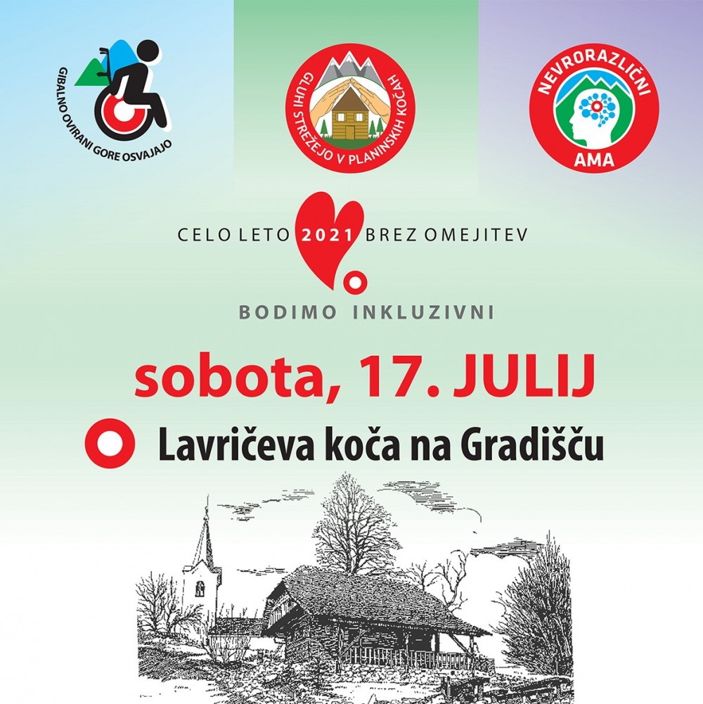 sreda, 7. julij 2021, ob 0. uri, ogledov: 2109 Inkuzijski pohod na Lavričevo kočo na Gradišču Splošno | | Planinstvo za invalide | | | Objavil(a): Marjeta Čič | | Vabljeni na inkluzijski pohod 17. julija na Lavričevo kočo na Gradišču . Gibalno ovirani gore osvajajo (GOGO) , Skupaj v hribe Nevrorazličini AMA (avtizem, motnja v duševnem razvoju, ADHD) in Gluhi strežejo v planinskih kočah so akcije, ki se med seboj povezujejo. Na poti do koče nam bodo delali družbo prostovoljci.