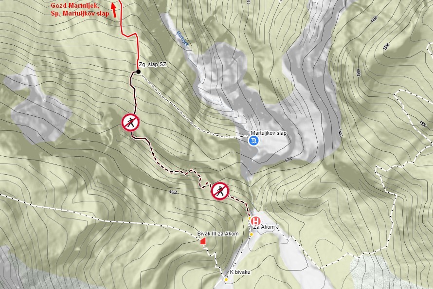 torek, 6. december 2022, ob 12.25 uri, ogledov: 2939 Pot v krnico Za Akom sanirana in ponovno odprtaPoti | | Komisija za planinske poti | Komisija za alpinizem | | Planinsko društvo Gozd Martuljk | | | Objavil(a): Matej Ogorevc | | Planinska pot med odcepom za Zgornji Martuljkov slap in krnico Za Akom (Bivak III) je obnovljena in ponovno odprta. | Prvotno obvestilo: Planinsko društvo Gozd Martuljek obvešča, da je prišlo na planinski poti med odcepom za Zgornji Martuljkov slap in krnico Za Akom (Bivak III Za Akom) do poškodbe varoval. Pot je posledično do nadaljnega zaprta.