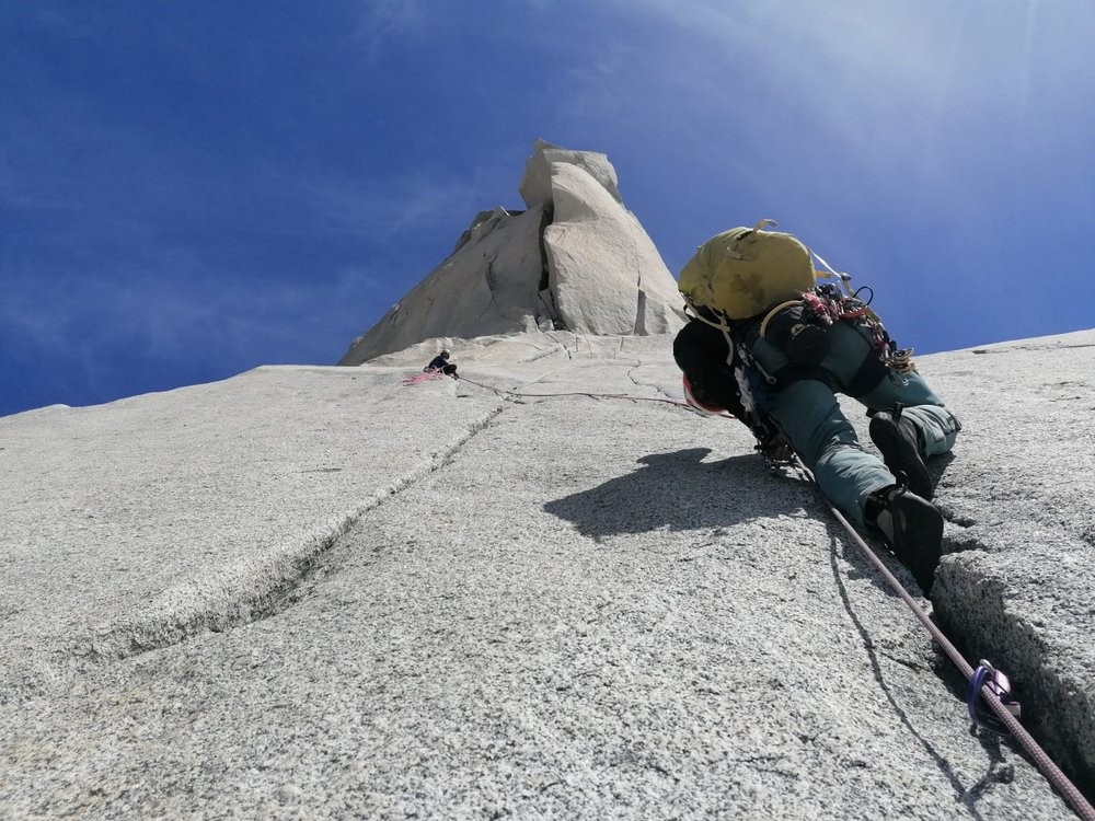 Po spustu na ledenik se je začela dolga pot po dolini, prečenje ledu in moren, vse mimo tabora Niponino, kjer smo spet zavili v strm klanec do našega tabora Noruegos in bivakirali pod velikim balvanom. Ponoči je naletaval sneg, zjutraj pa smo se zbudili v jutro brez oblačka in hitro smo bili pod smerjo Rubio Y Azul na Aguja De La Medialuna. Navdušeni smo bili nad strmim plezanjem in lepimi počmi ter neverjetnim prehodom v zadnjem delu smeri, kjer smo se po globoki zajedi kar skozi previsni vrh stolpa prebili do našega cilja. S spusti po vrvi smo bili hitro nazaj pod steno in se že veselili dolge poti v dolino, ki nas je čakala naslednji dan.