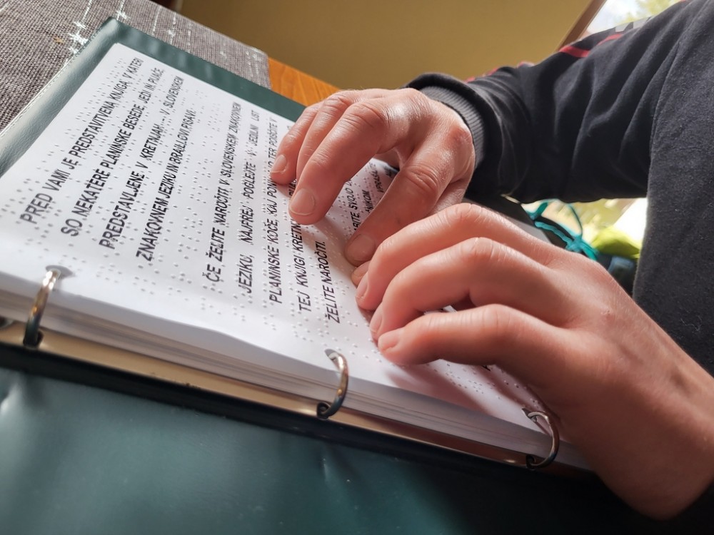 Na sliki mapa z besedilom opremljenim v brajici in tiskanimi črkami, na besedilu sta roki, ki sledita brajici, arhiv inPlaninec