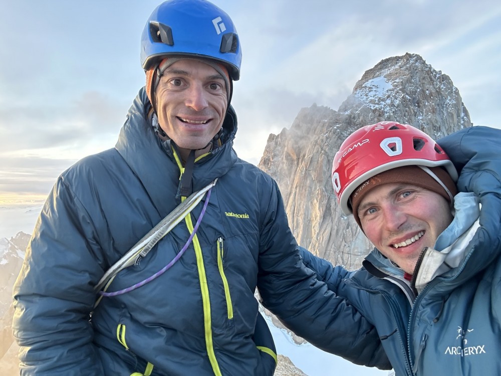 Luka Krajnc in Luka Lindič na vrhu prvenstvene smeri Pot v južni steni Poincenota v Patagoniji (foto Luka Lindič)