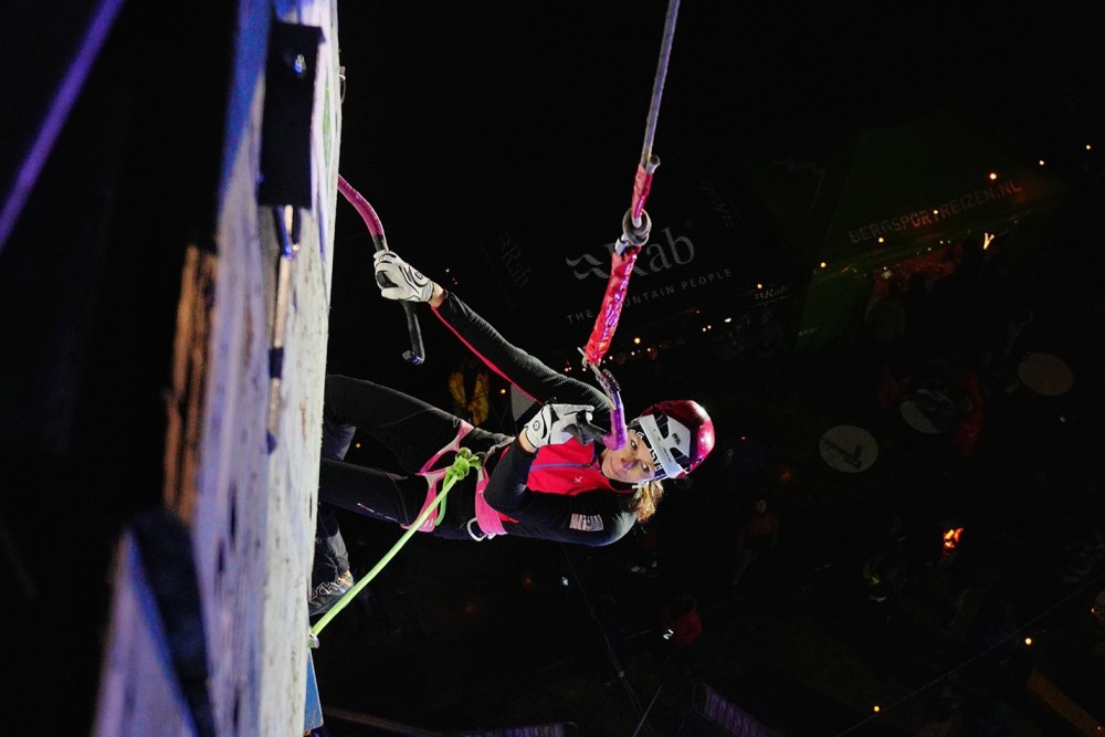 Maja Šuštar Habjan je bila s sedmim mestom na četrti tekmi celinskega pokala v tekmovalnem lednem plezanju najuspešnejša Slovenka v Utrechtu. (foto Robert Hendriksen)