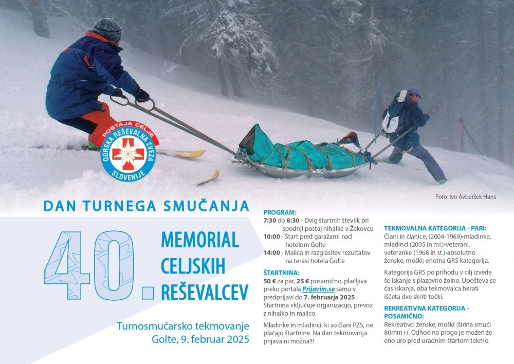 sreda, 5. februar 2025, ob 9. uri, ogledov: 518 40. Memorial celjskih reševalcev | dan turnega smučanja na Golteh - ODPOVEDANOGorski športi | | Komisija za gorske športe | | Turnosmučarski klub LiMa | Postaja Gorske reševalne službe Celje | | | Objavil(a): Manca Ogrin | | Memorial celjskih gorskih reševalcev, ki bo v nedeljo, 9. februarja 2025 na Golteh, je turnosmučarsko tekmovanje, ki bo štelo za državno prvenstvo v parih, v rekreativni kategoriji pa se bodo tekmovalci pomerili posamično. Letos obeležujejo že 40. obletnico organizacije prve turnosmučarske tekme v Sloveniji, ki so jo organizirali člani GRS Celje leta 1985. >>> Zaradi pomanjkanja snega je tekma odpovedana. | MEMORIAL CELJSKIH GORSKIH REŠEVALCEV >>> Zaradi pomanjkanja snega je tekma odpovedana.