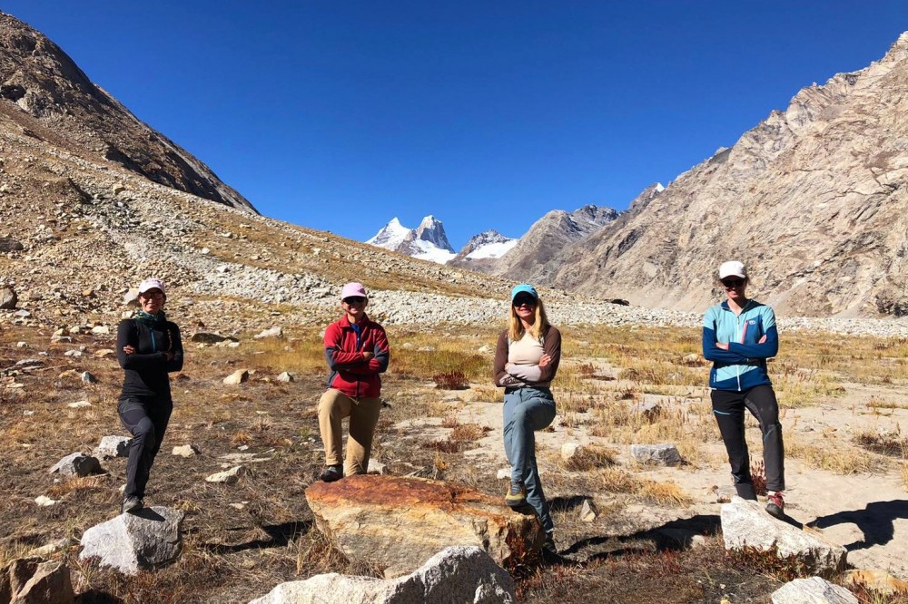 Članice ženske alpinistične odprave v indijsko Himalajo v baznem taboru: Urša Kešar, Patricija Verdev, Anja Petek in Ana Baumgartner. (foto Anja Petek)