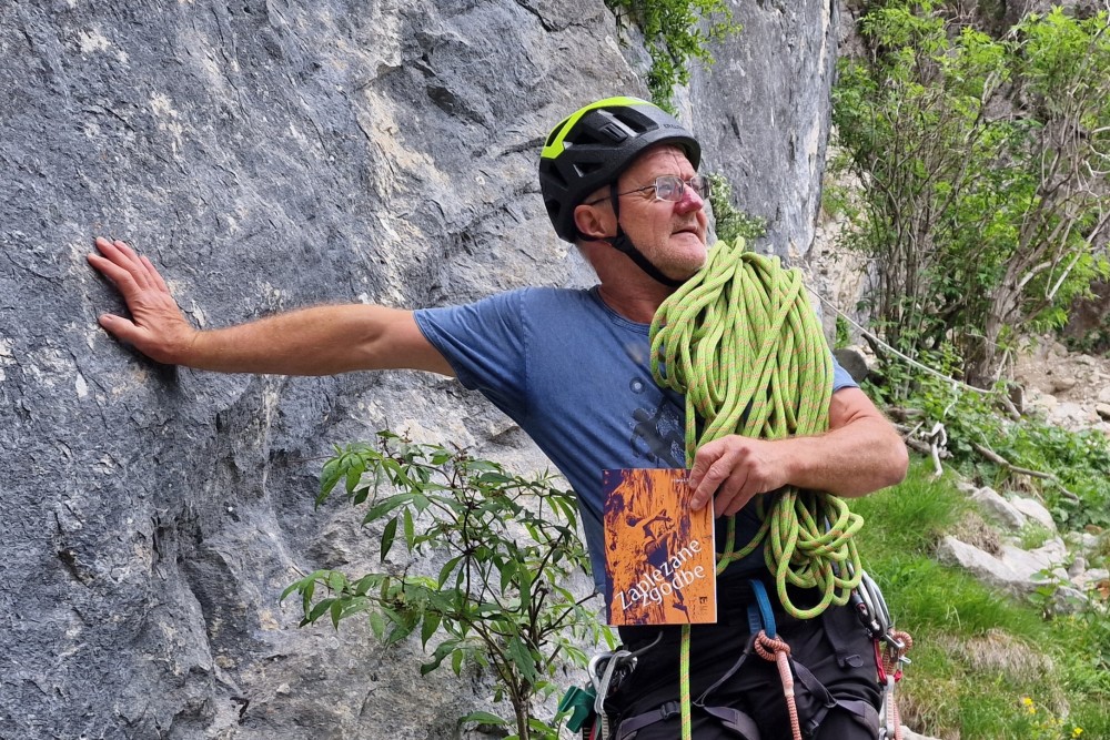 Tomaž Žganjar z Zaplezanimi zgodbami, prvo žepno knjigo Planinske založbe, pod steno Bele peči. (foto osebni arhiv)