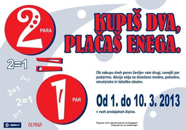 ponedeljek, 4. marec 2013, ob 0. uri, ogledov: 2790 Alpinina akcija, marec 2013: kupiš dva para, plačaš enega!Splošno | | | Objavil(a): Zdenka Mihelič | | V času od 1. do 10. marca 2013 v vseh prodajalnah Alpine poteka akcija: KUPIŠ DVA, PLAČAŠ ENEGA. Ob nakupu dveh parov čevljev vam drugi, cenejši par, podarijo. Ob nakupu enega para pa velja 40 % popust (popusti se ne seštevajo). Vabljeni! | Akcija