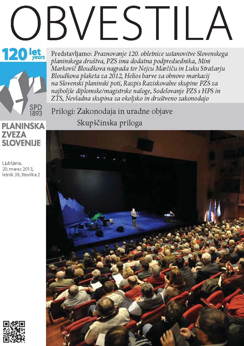 Predstavljamo: Praznovanje 120. obletnice ustanovitve Slovenskega planinskega društva, PZS ima dodatna podpredsednika, Mini Markovič Bloudkova nagrada ter Nejcu Marčiču in Luku Stražarju Bloudkova plaketa za 2012, Helios barve za obnovo markacij na Slovenski planinski poti, Razpis Raziskovalne skupine PZS za najboljše diplomske/magistrske naloge, Sodelovanje PZS s HPS in ZTS, Nevladna skupina za okoljsko in društveno zakonodajo. Naslovnica: Predsednik PZS Bojan Rotovnik o planinskih dosežkih v gorah in dolini na slavnostni akademiji ob 120-letnici ustanovitve Slovenskega planinskega društva, foto Žiga Živulovič Prijetno branje vam želi urednica Obvestil PZS Zdenka Mihelič