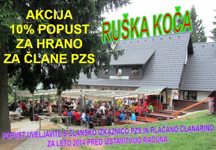 četrtek, 12. junij 2014, ob 0. uri, ogledov: 4747 Ruška koča nudi 10 % popust pri hrani za člane PZSSplošno | Koče | Društva | | Gospodarska komisija | | Planinsko društvo Ruše | | | Objavil(a): Zdenka Mihelič | | Planinsko društvo Ruše vas obvešča, da imate člani PZS s plačano članarino za tekoče leto v njihovi Ruški koči 10-odstotni popust pri hrani. | Obveščamo vas, da imajo člani PZS s plačano članarino za tekoče leto v njihovi Ruški koči 10-odstotni popust pri hrani.