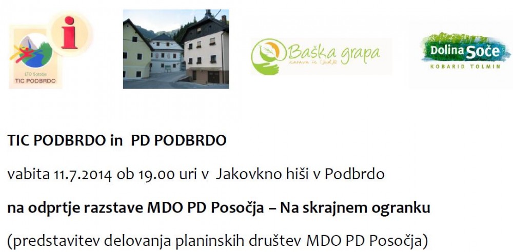 Program: Razstavo bo predstavil Žarko Rovšček, vodja delovne skupine, ki je razstavo sestavila in jo postavila na pot že v mesecu aprilu v Mojstrani, kjer se je slovesnosti v Planinskem muzeju udeležilo veliko predstavnikov planinskih društev MDO PD Posočja (PD Podbrdo, PD Tolmin, PD Cerkno, PD Črni vrh na Idrijo, PD Ajdovščina, PD Nova Gorica). Program odprtja pa bodo oblikovali tudi mladi glasbeniki iz Podbrda ter sogovorniki.