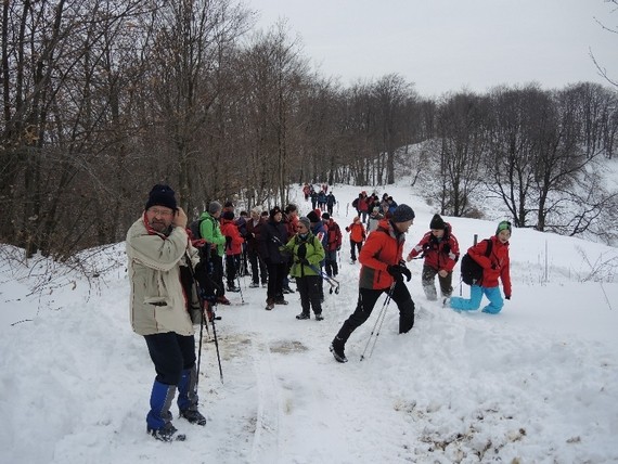 Nismo se ustrašili vremena in ne zasneženih poti. Že 14. smo odšli po makolskih gričih, po vzhodnem delu makolske meje z majšpersko občino. Tokrat nas je bilo okrog 60 neustrašnih planincev iz vseh koncev Slovenije. Skupina iz Domžal je pripeljala s sabo Borisa Kopitarja, popestrili so pohod s slovenskim petjem. Skupina mladih makolskih planincev z mentorjem se je zelo veselila novozapadlega snega.