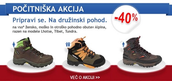 sreda, 25. februar 2015, ob 0. uri, ogledov: 3899 Alpinina počitniška akcija pohodniške obutveSplošno | | | Objavil(a): Matej Ogorevc | | Zimski družinski pohod je lahko poceni, a neprecenljivo doživetje. V času počitnic lahko vso družino opremite ugodno. | 40% popust na vso