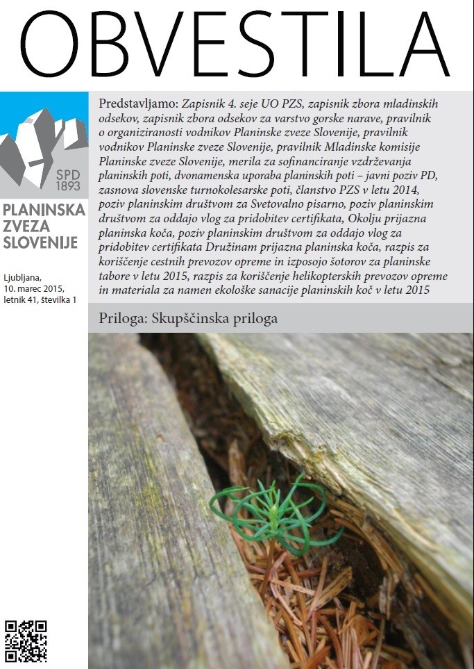 četrtek, 12. marec 2015, ob 0. uri, ogledov: 2823 Nova Obvestila, nova pomladDruštva | Splošno | | Obvestila PZS | | | Objavil(a): Manca Ogrin | | Izšla je prva letošnja številka Obvestil PZS z obsežno Skupščinsko prilogo - pred skupščino PZS, ki bo 11. aprila 2015 v Sevnici. Vabljeni k branju! | Lani ob takšnem času smo se v planinski organizaciji ukvarjali predvsem s katastrofalnimi posledicami žledu. Na marsikateri poti je posledice pustil tudi snegolom, skratka lansko leto je bilo prav zares leto planinskih poti. A so pridne roke neštetih markacistov v letu dni uspele očistiti in urediti praktično vse poti, ki so bile poškodovane po februarskem ledenem oklepu. Le še 16 poti je zaprtih, če držijo podatki, ki jih redno osvežujemo na spletni strani www.stanje-poti.pzs.si.