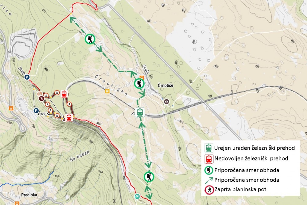 Najbližji možen prehod železniške proge je možen skozi podvoz gozdne cesta pri vasi Černotiče (obhod in prehod označena na spodnji sliki).